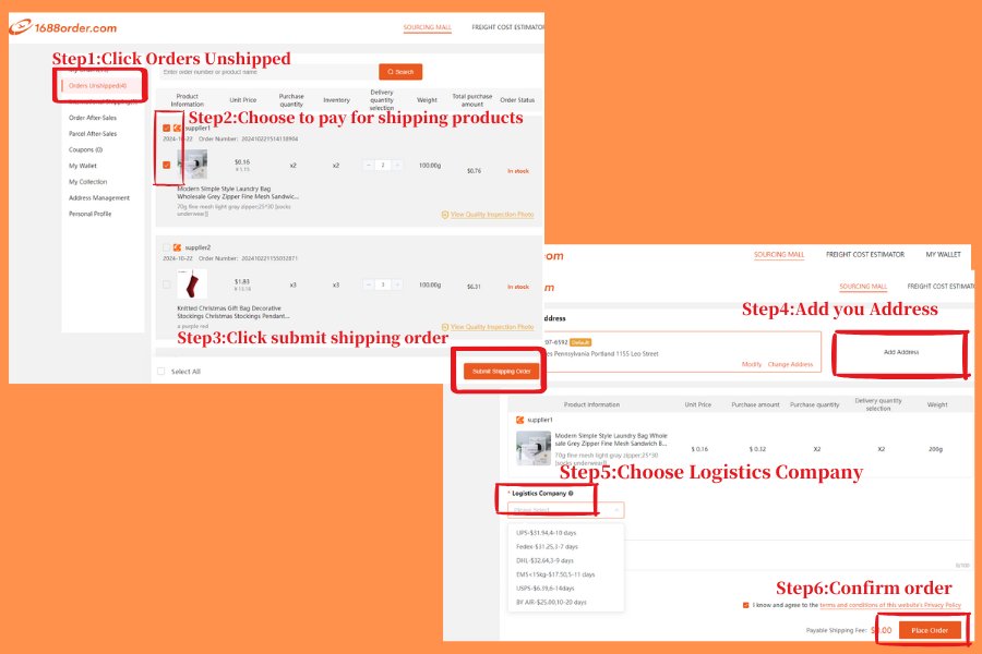 Click Orders Unshipped—>Choose products—>Click submit—>Add address—>Choose logistics—>Confirm package size and weight—>Pay international shipping